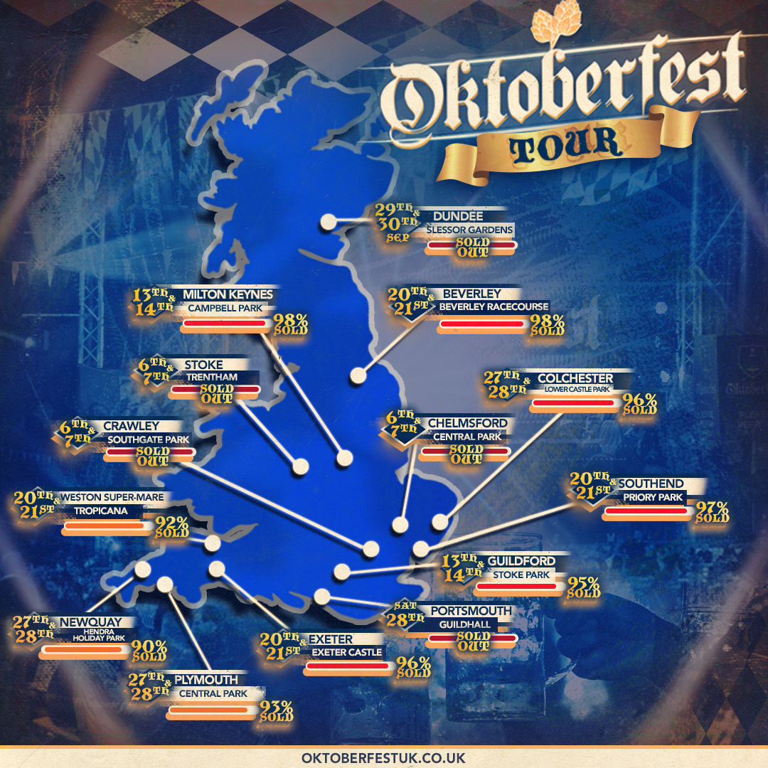 Map of Oktoberfest Events happening around the country and the percentage they have sold out to increase people buying tickets.